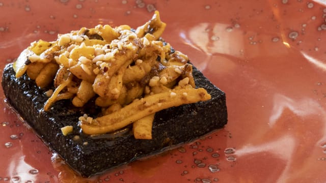 Seppioline saltate con crema di edamame e crumble al nero di seppia