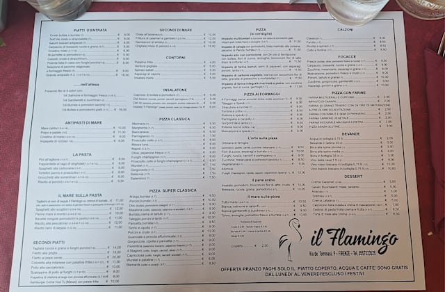If you plan to eat at Il Flamingo, the average price should be around €15. The average price is calculated based on appetizer/entrée or entrée/dessert, excluding drinks. Prices have been provided by the restaurant.