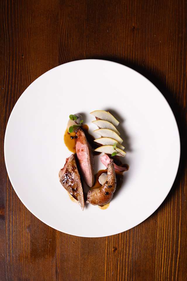 - .Pigeon Breast served with Pear and Castagnaccio Cake.