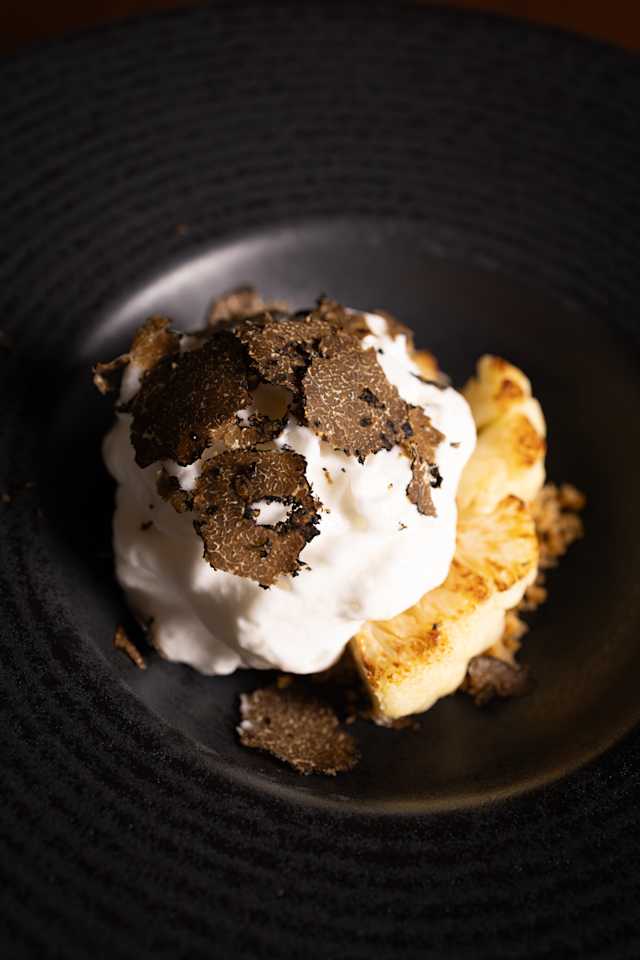 - .Porcino Mushroom, Potato, Scamorza Cheese Cream and Catmint.