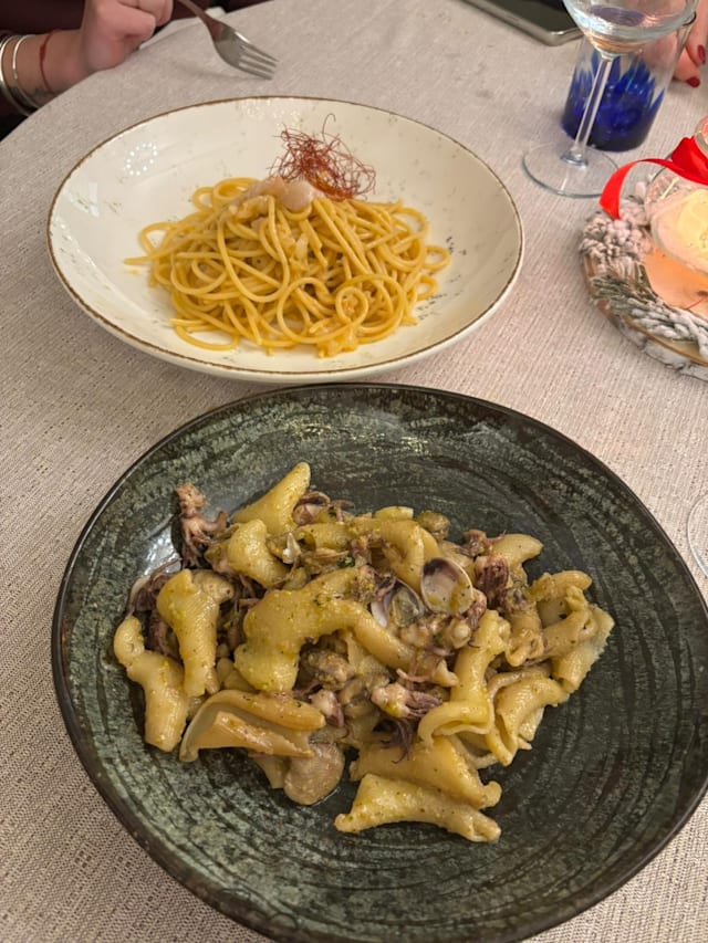 Maccheroncini con pesto di pistacchi, totani e vongole