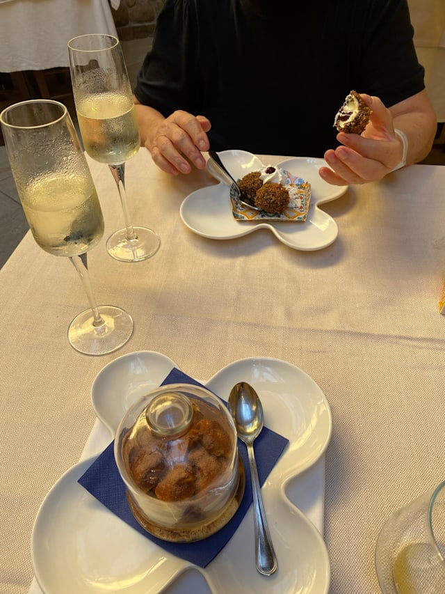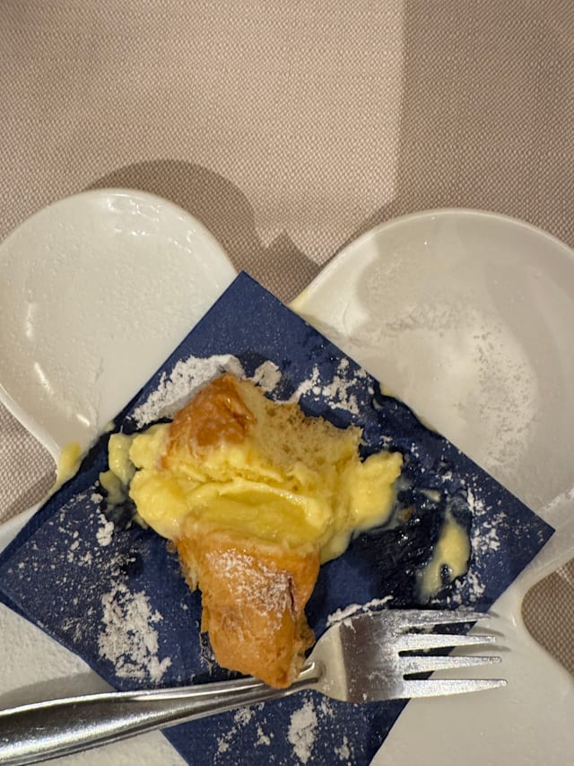 Signora mi ricordo benissimo . Aveva due camerieri a sua disposizione , Ci dispiace averla delusa e chi vien è da noi sa benissimo quanto ci teniamo . Le rispondo e cerco di essere breve : l’acqua vien portata appena dopo che gli consegniamo il menù il cameriere se è avvicinato se era tutto bene e lei ha risposto che la carbonara era fredda e il cameriere ha chiesto che se vileva la riportava in cucina e rimediare , lei ha risposto che no importava ( il piatto è entrato vuoto in cucina . Io Maria mi sono avvicinato chiedendo se era tutto apposto e voi mi avete detto Tutto buono , c è qualcosa che non mi quadra . Il prezzo forse ( gli abbiamo fatto una piccola cortesia sul prezzo)Cara signora quando è uscita l’abbiamo salutata e io gli ho richiesto come mia abitudine Signora Is ok ? E lei yes Sono stata sempre presente in sala e nessuno l’abbandonata e la pasta nessuno si è dimenticata (. 15 minuti servono per prepararla non cibo precotto) si rilassi e si goda la vacanza