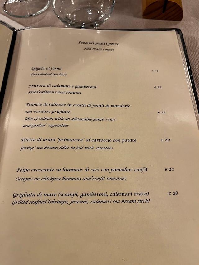 10/10The food was excellent. I had salmon and my husband had the bream both of which were cooked perfectly and served with vegetables. One of us tried the classic tiramisu and the other had the pistachio and they were both divine. Reasonable cost for a city centre restaurant. Would recommend.