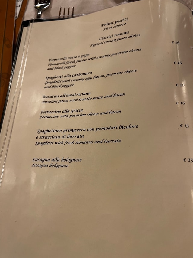 Tonnarelli cacio e pepe, spaghetti alla carbonara, bucatini all'amatriciana, mezze maniche alla gricia