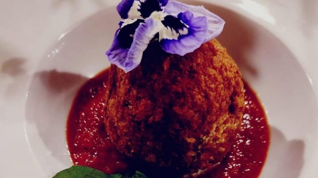 Polpette di scottona al sugo, provola affumicata, chips di melanzane
