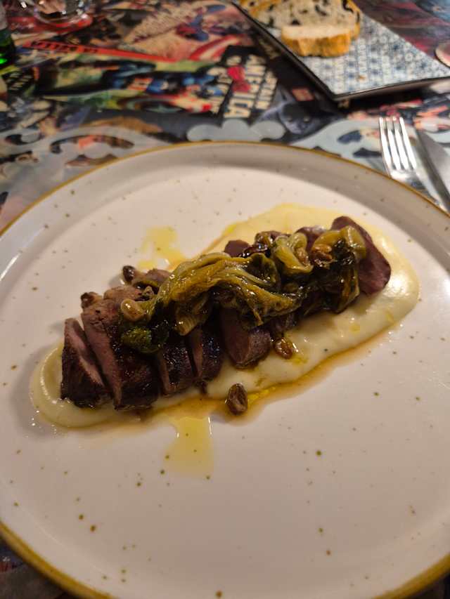 Speck di anatra,spuma di bufala affumicata e pere caramellate