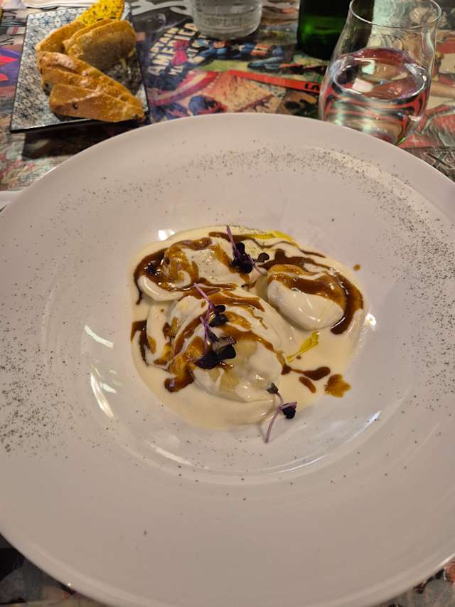 Ravioli farciti con parmigiano e tartufo bianchetto, crema di spinaci e mandorle tostate