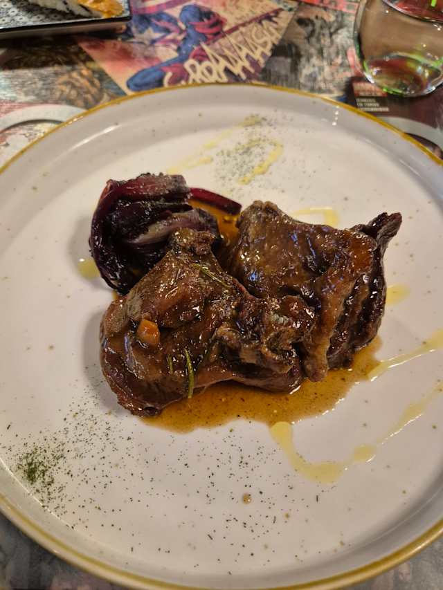 Coniglio ripieno di lardo,cicoria ripassata, salsiccia di luganega e carote baby caramellate