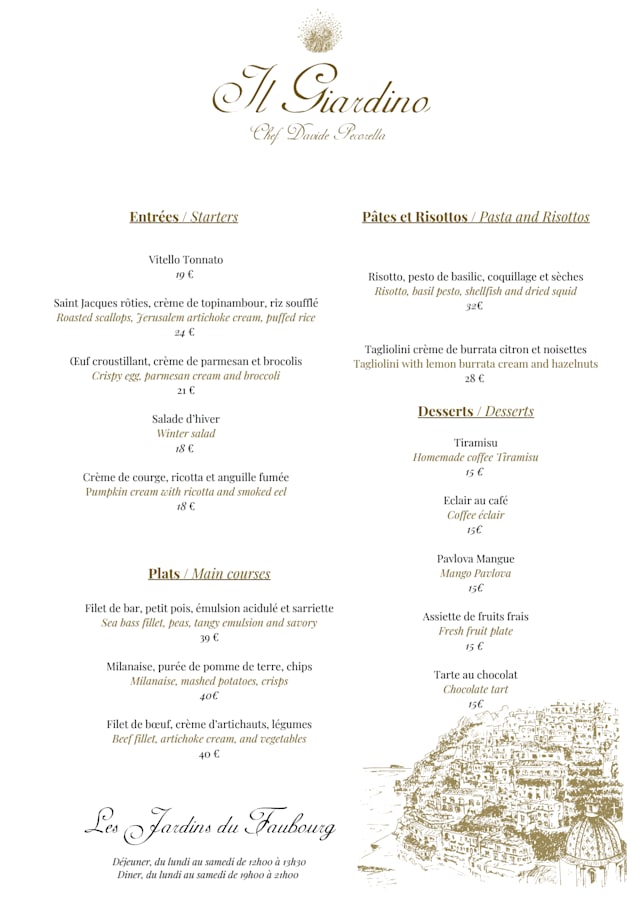 Il Giardino vous propose une cuisine italienne gourmande et raffinée signée du Chef Davide Pecorella qui a fait ses armes dans de prestigieuses maisons. Chaque jour son équipe met à l’honneur des produits frais et savoureux en préparant des recettes inspirées de sa grand-mère. Pour accompagner agréa...