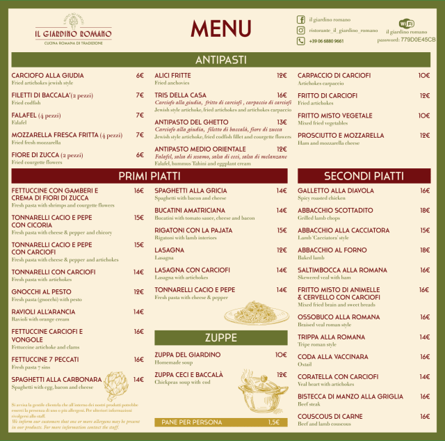 8/10you cannot miss artichokes giudei and, if you like 5th quarter of meat coratelle and fried brain. However everithig is delicious. location in the middle of Jews ghetto gives the opportunity to feel real roman old style atmosphere. very recommended