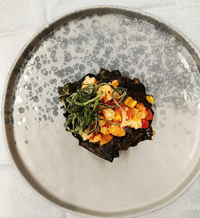 - Spaghetti (pasta) from Gragnano with asparagus and crunchy Seabass hummus marinated with cirtus and miso
