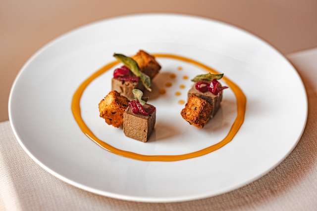 - Foie gras di fegatini di pollo, pan brioche alle noci, cipolla in agro di lampone, riduzione di vinsanto