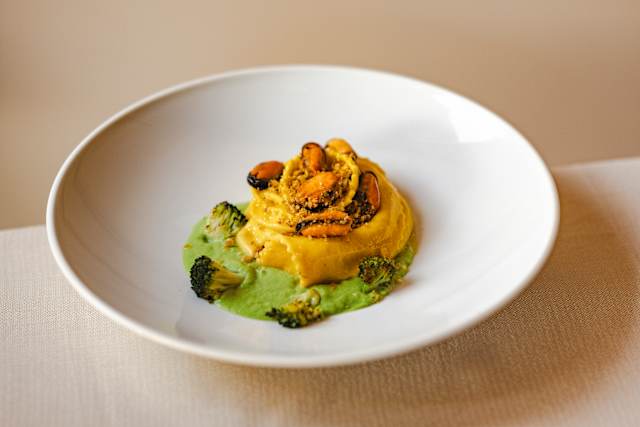 - Pappardelle ripiene di ricotta e limone, broccoli in due consistenze, cozze e crumble alle acciughe