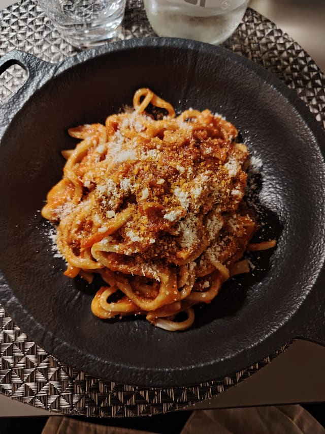 Pasta tipica fatta a mano. Piatto della tradizione laziale con guanciale amatriciano e la nostra passata di pomodoro