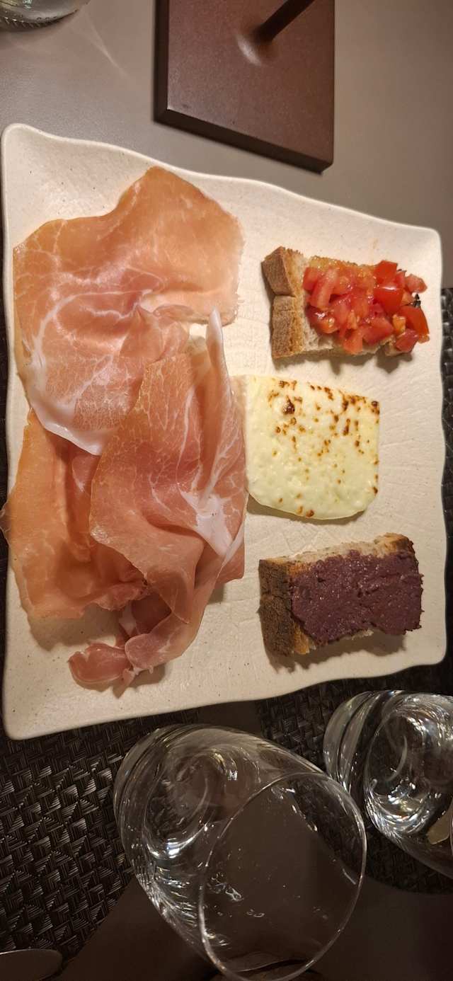 Prosciutto crudo di guarcino, primo sale di fiuggi alla griglia, bruschetta ai pomodorini di fondi, bruschetta con crema di olive alla mediterranea