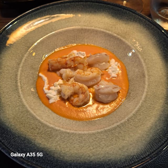 Code di gamberi scottate al timo con succo di pomodoro e burrata