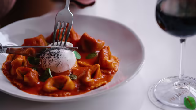 - Raviolis recheados com carne de vaca estufada lentamente, servidos com molho do próprio assado, folhas de sálvia, presunto em pó e parmesão ralado.