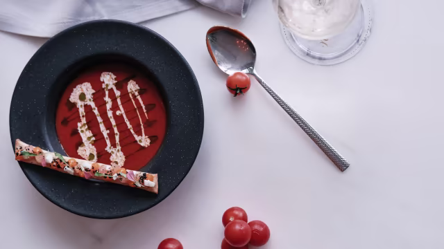 - Creme de tomate aromatizado com estragão, servido com bocconcini de mozzarella, creme de gema, natas e crumble de tomate.