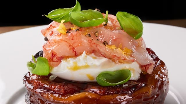 Burrata, crudo di gambero rosa, limone e basilico