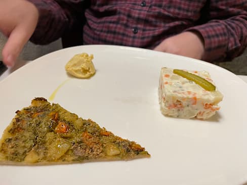 9.5/10We had a glass of wine with the black bean lasagna and vegetable pie with house salad, stiff water, and bread. Only regrets was that all the food came at once; including the salad. Oft the beaten path little hideaway with delicious offerings.