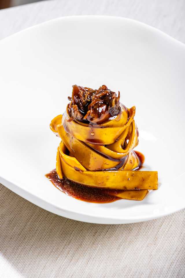 - Fettuccelle di pasta fresca con faraona di miroglio e funghi porcini essiccati dell’abetone