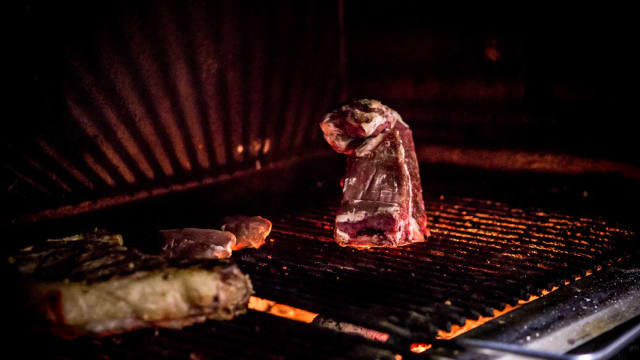 Cotta un giorno intero a bassa temperatura e pol rifinita sulla brace. Servita con patate arrosto e salsa chimichurri.