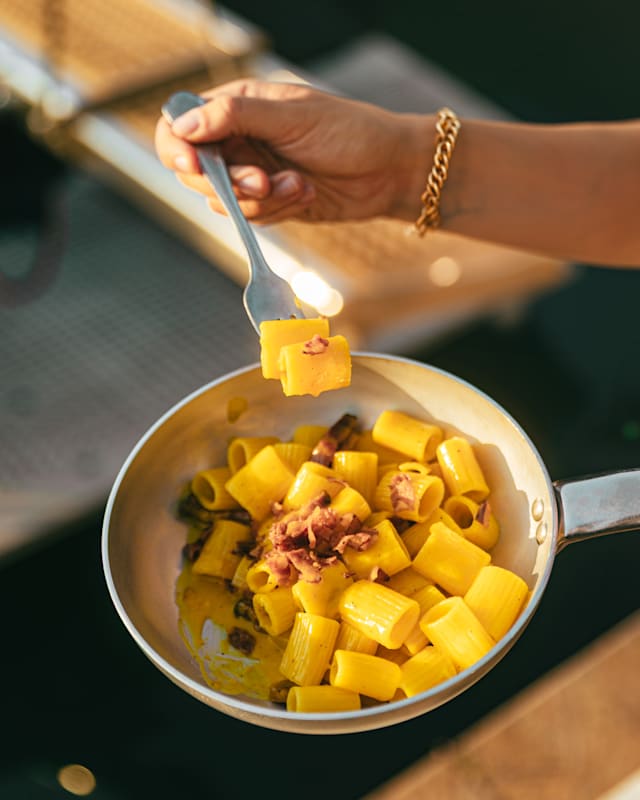 Uova a pasta gialla allevate a terra, pecorino romano dop 16/18 mesi, parmigiano reggiano 28/30 mesi, guanciale nazionale metodo tradizionale