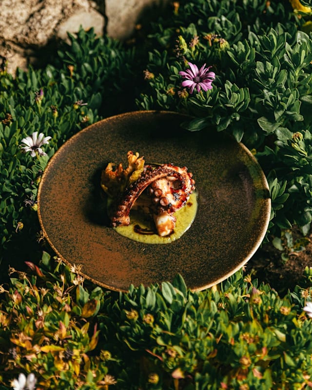 Polpo su crema di zucchine e menta, teriyaki e fiore di zucca croccante