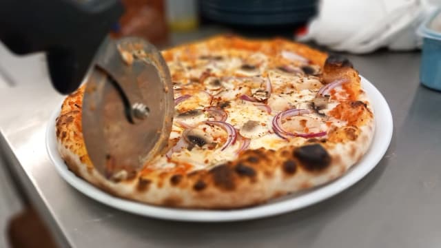 Molho de tomate biologico, mozzarella fiordilatte, bacon, cebola, ovo, parmegiano e oregab
