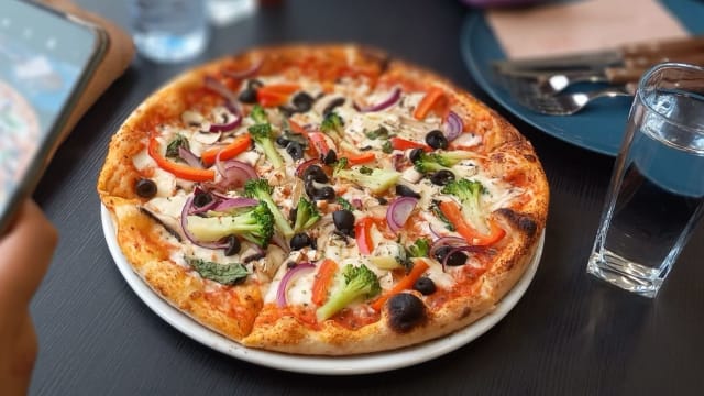 Molho de tomate biologico, mozzarella fiordilatte, cogumelos, courgette grilhado, beringela grilhado, brotolos, pimentos assados e manjericab