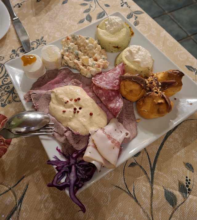 - Vitello tonnato, flan di verdure con crema di acciughe, bignola alla piemontese, tomino in salsa roosa
