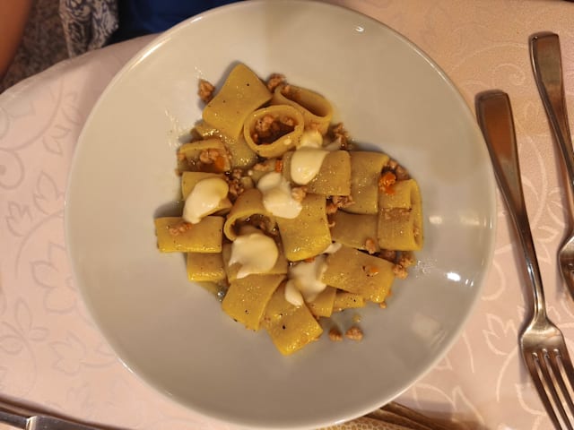 Ravioli ricotta e parmigiano in salsa di zucca e salsiccia