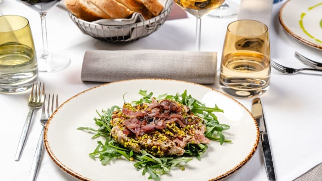Tagliata di tonno a pinna gialla con pistacchio verde di bronte e cipolla caramellata di tropea, su letto di rucola