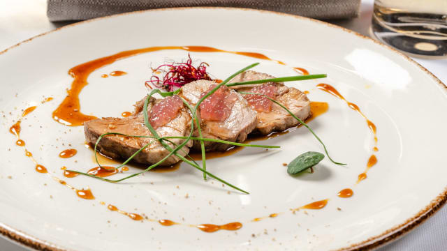 Filetto di maialino iberico cbt con riduzione allo chablis e caviale di cipolla di tropea
