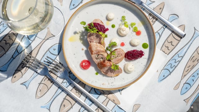 Porchetta di tonno farcita con lardo e aromi, maionese al rosmarino e cipolla caramellata