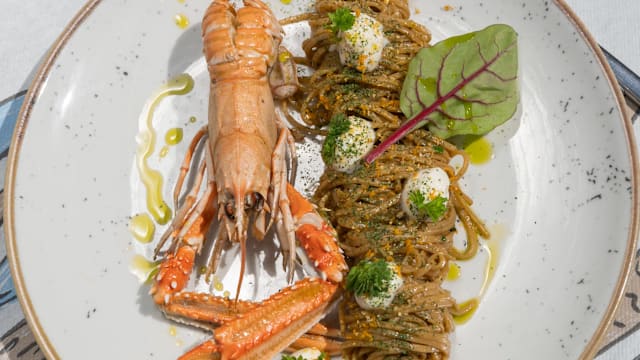 Tagliolino di pasta fresca home made con scampi, cremoso di burrata e agrumi di sorrento