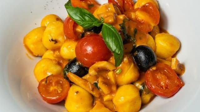 Gnocchi with a garlic tomato sauce, basil, and fresh mozzarella
