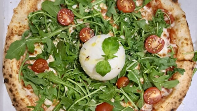 Molho de tomate biolégico, mozzarella fior di latte, burrata, tomat cereja, rúcula, azeite biolégico e orégào.