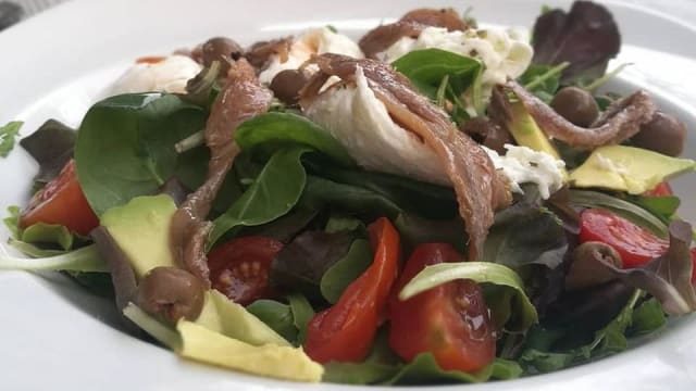 Misticanza, pomodoro, acciughe, avocado, olive, carote, mozzarella, vinaigrette e semi di zucca