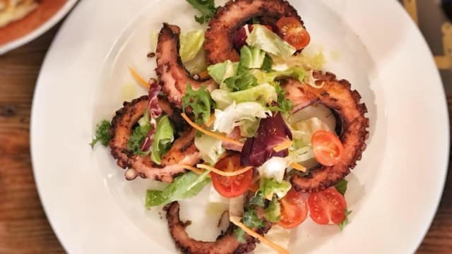 Tentacolo di polpo* alla griglia con soffice di patate dolci crema di peperoni rossi e terra di olive taggiasche