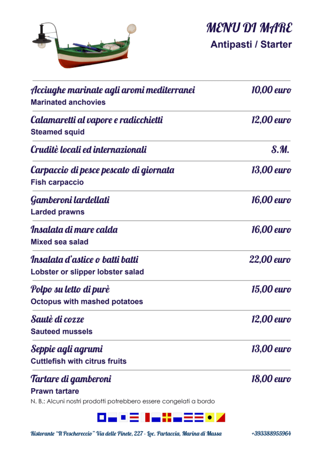 Il ristorante "Il Peschereccio" prepara tutti i piatti di pesce più classici con pesce pescato nostrale o congelato a bordo.