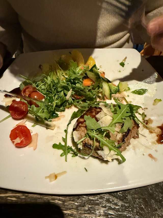 - Getrancheerde entrecote met rucola, parmezaanse kaas, balsamico cremé en tomaat