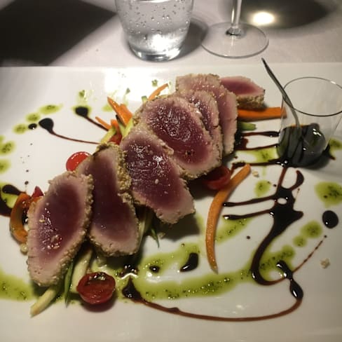 5/10The place of the restaurant is extraordinary - on the top of hill over Bergamo so the views are stunning. The tables are placed in the garden what creates magical atmosphere indeed. But that’s all. The food was realy disappointing and the prices do not reflect quality at all. We took 2 starters (melon with ham and beef tartar) and then risotto with shrimps and lamb rack. Starters were nothing special as for such highly rated place, the serving very simple and the taste so so (beef for tartar was more grated but not minced). There was only 1 shrimp in risotto and I felt like I’m eating risotto with sand - the same creaking between teeth, maybe because of sandy seafood. I left more than half as it was unpleasant to eat it :( My husband took lamb rack and it comes in the pink salt ‘coat’. The waiter unpack the dish in front of you, cuts it and serves. Again, maybe it’s a specific way to prepare meat but all these melted fat on the roasy really didn’t whet the appetite. But the meat was good - soft and juicy.
