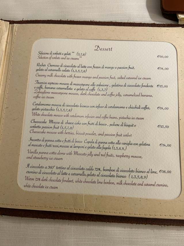 - Dolce - rocher – cremoso di cioccolato al latte con frozen di mango e passion fruit, gelato al caramello salato.
