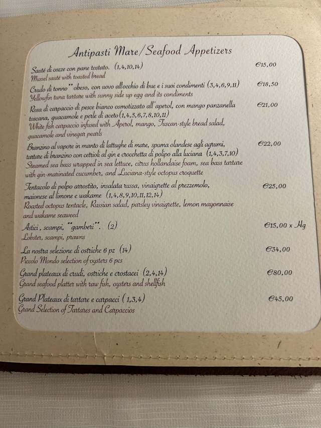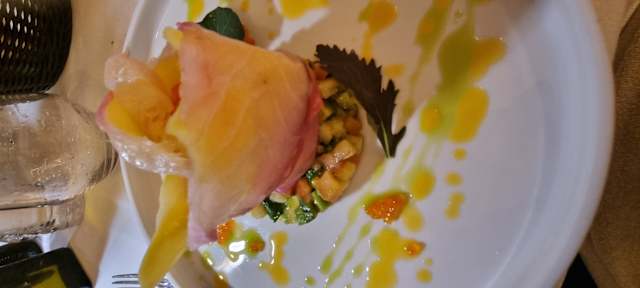 - Antipasto - branzino al vapore in manto di lattughe di mare, spuma olandese agli agrumi, tartare di branzino con cetrioli al gin e crocchetta di polipo alla luciana