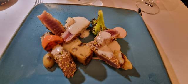 - Secondo piatto - filetto di tonno obeso con pistacchio, salsa tonnata e verdure autunnali ripassate