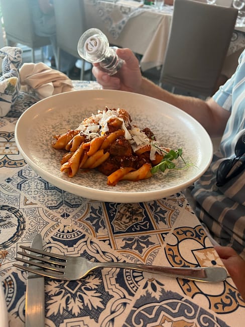 8/10Beautiful view for a sunset dinner! The starter was caprese three ways - three different mozzarellas, 3 varieties of tomatoes and 3 sauces. It was my favorite Caprese of our Italy trip. The pasta and lamb shank were both fine, not amazing. But the value is pretty good for the area and competing restaurants.