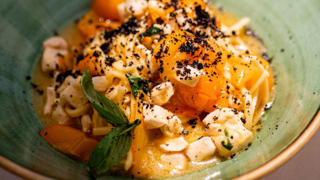Short pasta "cortecce" with yellow tomatoes, amberjack, black olives powder and basil