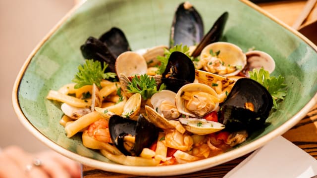 Home made pasta clams, calamari, shrimps and fresh tomatoes