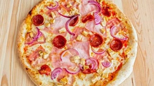 Molho de tomate, mozzarella, pepperoni, fiambre, bacon, frango, cebola roxa e